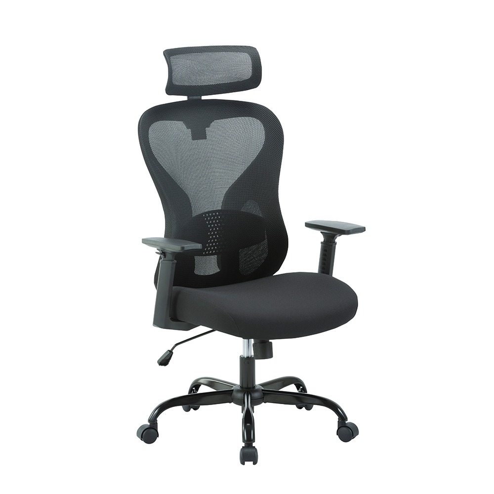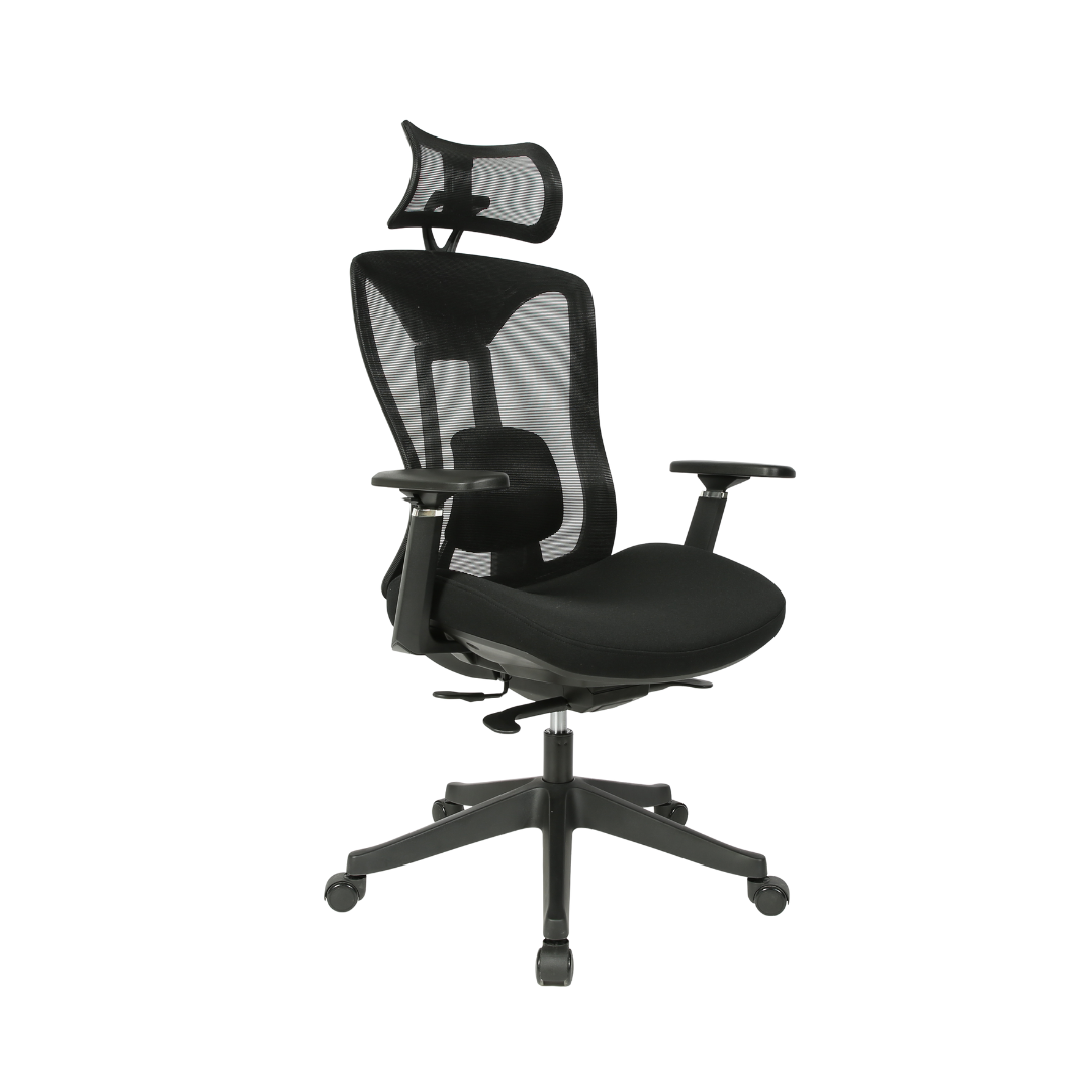 כסא מנהלים מעוצב, משענת ראש, ריפוד בד-רשת, מנגנון החלקה, ידיות מתכווננות