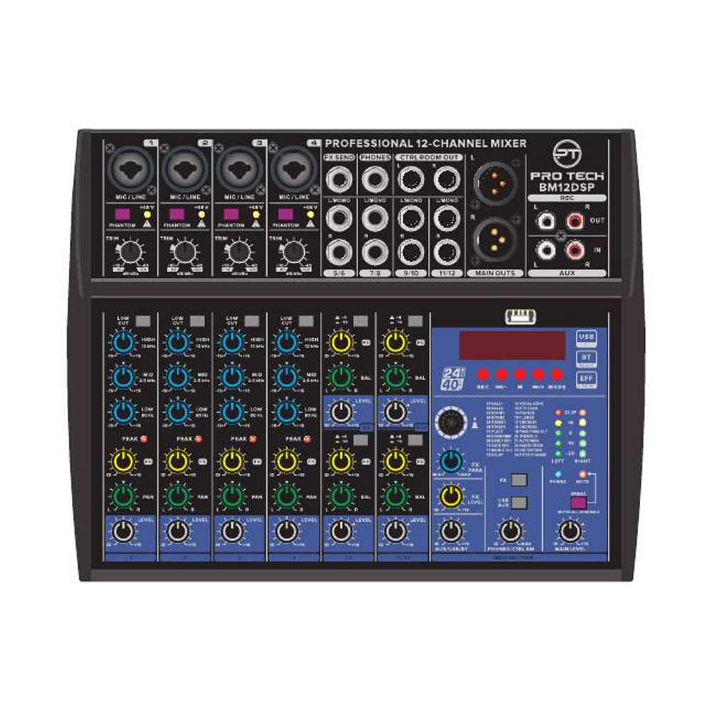 ה-PRO TECH BM12DSP הוא מיקסר סאונד מקצועי ורב-תכליתי הכולל 12 ערוצי עבודה (4 ערוצי מונו ו-4 ערוצי סטריאו), מה שהופך אותו לפתרון אידיאלי עבור הרכבים מוזיקליים, פודקאסטים, אולפנים ביתיים ואירועים חיים הדורשים מספר רב של כניסות. ערוצי המונו מצוידים בכניסות קומבו (XLR/PL), קדם-מגברים שקטים, אספקת מתח פנטום (+48V) למיקרופוני קונדנסר, איקוולייזר בעל 3 תחומי תדר ולחצן חיתוך תדרים נמוכים לשמירה על צליל נקי ומדויק. המיקסר כולל מעבד אפקטים דיגיטלי (DSP) מובנה עם 24 תוכניות שונות המעניקות ליטוש מקצועי לסאונד בזמן אמת, לצד קישוריות Bluetooth להזרמת מוזיקה אלחוטית, נגן/מקליט USB עם תצוגה דיגיטלית וממשק אודיו (כרטיס קול) לחיבור ישיר למחשב לצורך הקלטות והפקה דיגיטלית נוחה. בזכות מבנה קשיח, יציאות מאסטר XLR מאוזנות ושליטה נפרדת על כל ערוץ, הוא מספק גמישות עבודה מקסימלית וביצועים גבוהים בחבילה אחת עוצמתית וניידת.